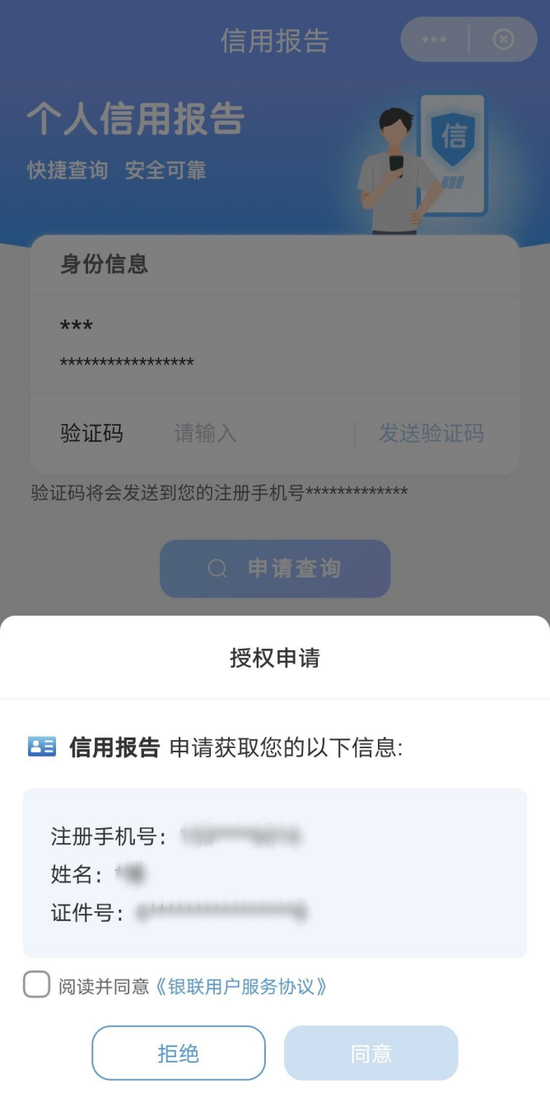 用户首次进入信用报告小程序,须勾选阅读并同意《银联用户服务协议》,点击同意用户信息授权后进入下一步,拒绝或不勾选协议则无法进入下一步。