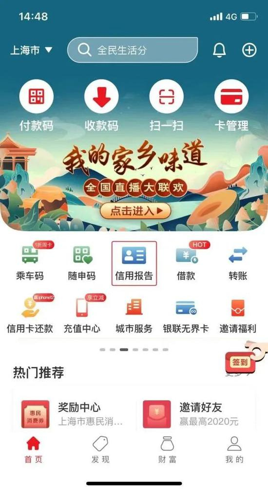 打开云闪付APP,定位在上海市,点击首页或城市服务的“信用报告”小程序。