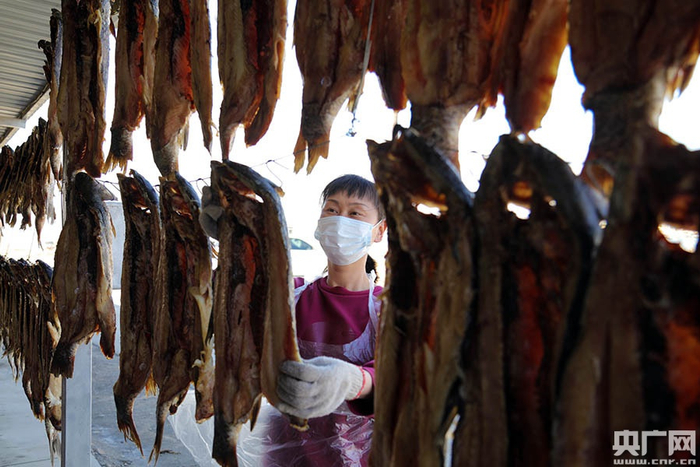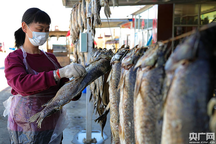 3月31日,在博湖县西海社区的西海龙渔村农家乐,负责人正在查看风干鱼晾晒情况。胡侍琦 摄 央广网发