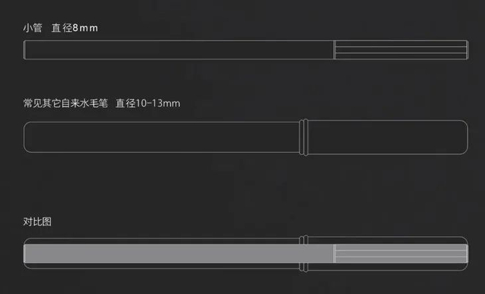 多数自来水毛笔由于直接采用市面通用钢笔组件,导致其外观异常粗大,超过13mm的比比皆是,既书写不便,也缺少优雅的握持美感。