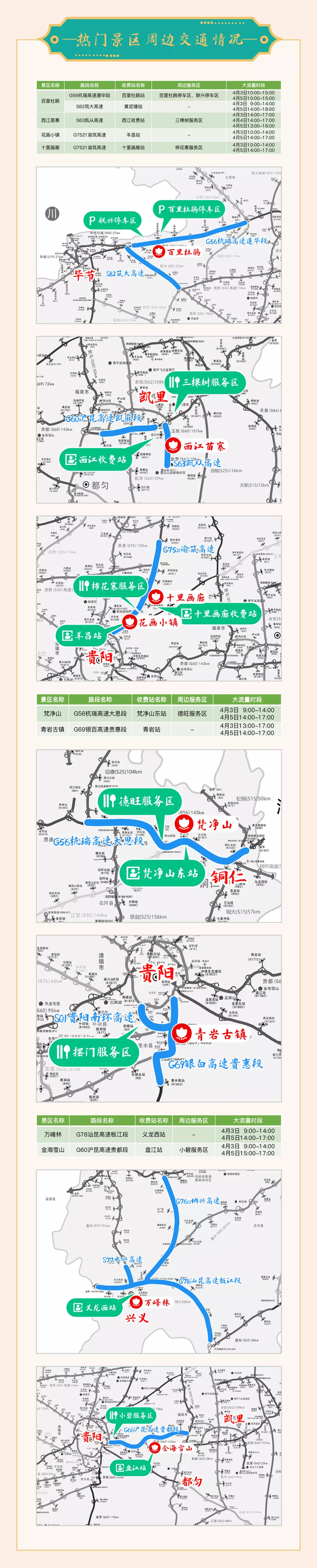 贵阳清镇红枫艺术陵园附近的G60沪昆高速贵清段庙儿山站、安顺平坝忆江南公墓附近的G60沪昆高速清镇段平坝站和夏云服务区,4月3日9:00至14:00,4月5日15:00至17:00车流量大。