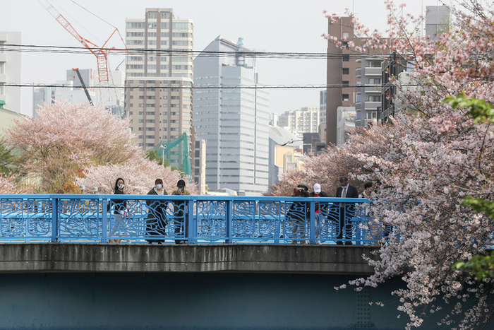 4月1日,人们在日本东京欣赏目黑川沿岸的樱花。新华社记者杜潇逸摄