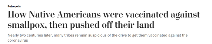 △《华盛顿邮报》的报道援引圣塔菲印第安学校领导力计划主任佩科思的话说,接种天花疫苗不是为了印第安人的利益,而是为了侵占他们的土地。