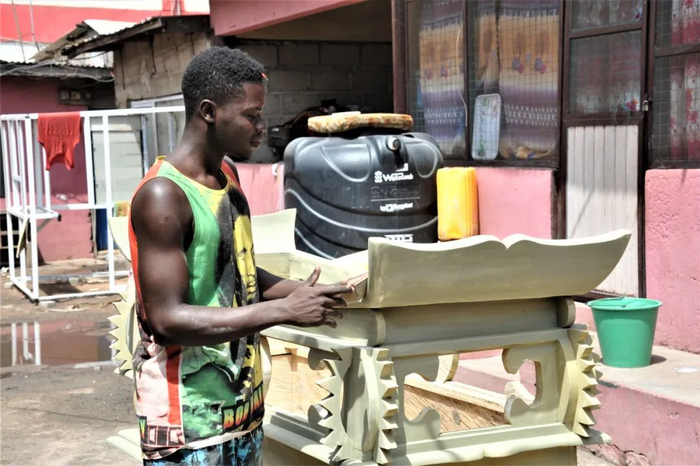 ▲3月23日,在加纳首都阿克拉主城区一家棺材铺里,加纳青年劳伦斯·阿南格在制作棺材。新华社发