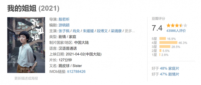与《你好,李焕英》“母爱大过天”这种所谓“正能量”大主题相比,《我的姐姐》探讨女性困境的主题,既然该片容易获得观众关注,也让该片容易遭诟病。目前两万多名豆瓣网友给《我的姐姐》的综评分是7.4分,远低于《你好,李焕英》的8.1分。
