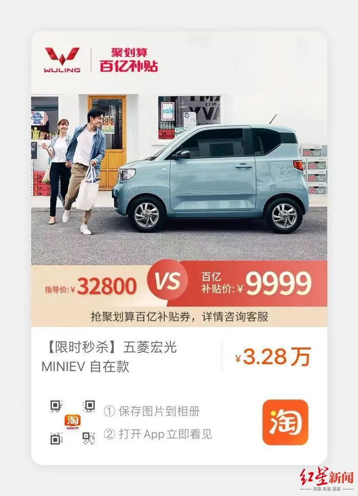 最低2.88万元的售价是五菱宏光MINI EV的最强竞争力,该公司也在不断强化低价这一印象。4月1日-2日,五菱宏光MINI EV在淘宝聚划算百亿补贴有整点秒杀活动,原价3.28万元的自在款车型,秒杀价9999元。也就是说,不到1万元就能拥有一辆新能源汽车。