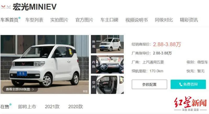 新能源汽车品牌宏瑞汽车,近期也推出了微型电动车宏瑞小虎,共有两款车型,价格分别为4.58和4.88万元,该车定位五门四座微型纯电动车,配备磷酸铁锂电池,后置单电机功率48千瓦,最大扭矩105牛·米,工信部续航里程170公里。