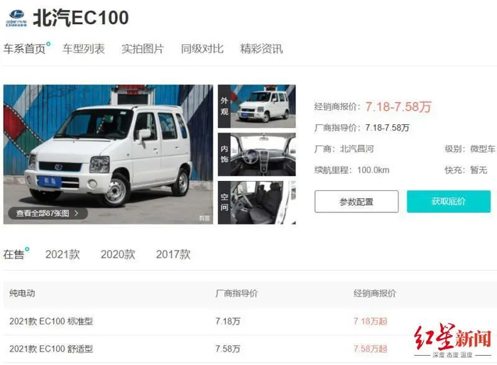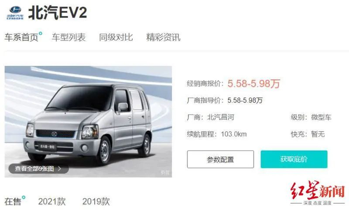 其中,2021款北汽EC100为5门4座两厢车,2021款北汽EV2为3门2座两厢车。