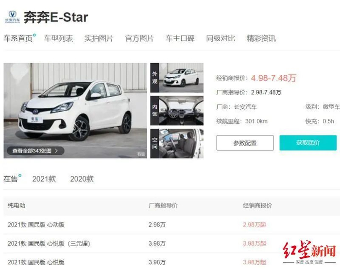长安汽车推出的奔奔E-star国民版,共三款车型,售价分别为2.98/3.98万元。续航里程150-301km、五门五座。电机功率为55千瓦,最大扭矩170牛·米,配备磷酸铁锂电池组或者三元锂电池,慢充时间5.5-8.35小时。