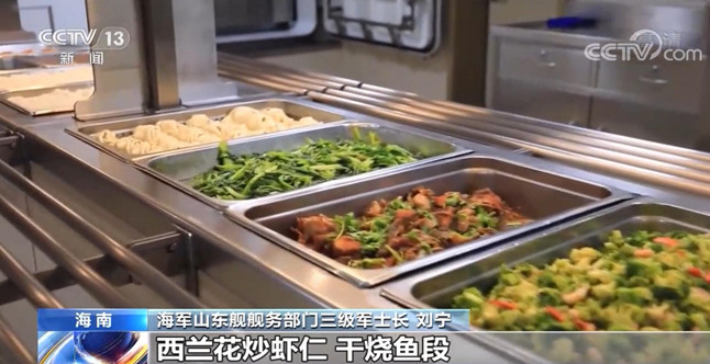 总台央视记者 李宁:航空母舰是一个非常复杂的大系统,就好像海上漂浮的一座城市,每次执行任务都是好几千人共同参与。这么多的人物资供应如何保障,他们每天都吃什么?