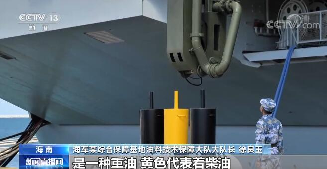 海军某综合保障基地油料技术保障大队大队长 徐良玉:对,不同的颜色代表不同的油料品种。比如说黑色的话,就代表我们的海军的燃料油,是一种重油,黄色代表着柴油,蓝色的代表了航(空)煤(油),我们也叫高闪点喷气燃料,就是为航母上飞机输送的油料。