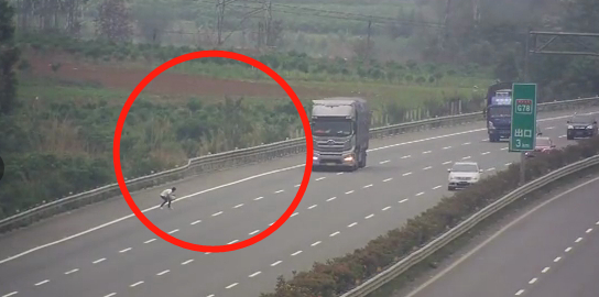 接着,令人震惊的一幕出现了:监控录像显示,一名年轻男子怀抱小孩走在应急车道上,看到有大车开过来,快步冲上前去,把双手往前伸,疑似要把孩子扔出去,路过的车辆纷纷减速变道避让。