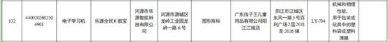 生产者为河源市乐源智能科技有限公司的电子学习机“乐源全民K歌宝”抽查发现机械和物理性能与用于包装或玩具中的塑料袋或塑料薄膜2个项目不合格,规格/型号为LY-704,检验报告编号为4400202602504901,抽样场所为广东孩子王儿童用品有限公司阳江江城店。