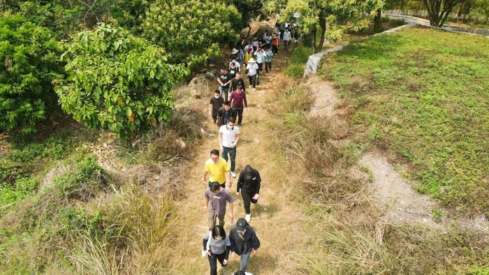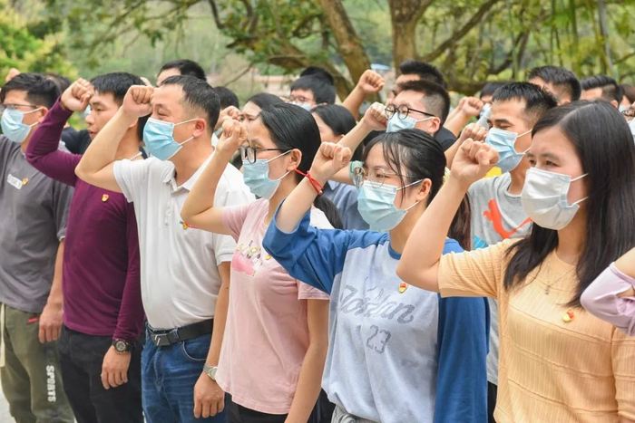 当天上午党史课堂结束后,85名学员就立马投入到第二个培训环节——重走革命小道。该环节参照当年中共增龙博中心县委党员干部训练班开展的演练活动情景,假设前方哨兵发现了敌人来犯的行踪,学员们需要紧急集合,并用最快的速度返回中共增龙博中心县委机关所在地,传递信息并参加作战,全程约2公里。记者看到,这条2公里的革命小道大多是崎岖的山路,学员们一步一个脚印,在紧张的节奏中,以饱满的精神状态追寻着革命先辈的足迹。到达目的地后,大家齐唱革命歌曲,庆祝胜利到达;重温入党誓词,深悟初心使命。