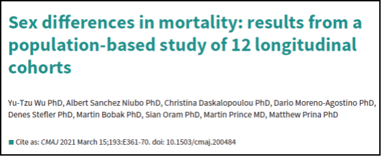 英国的研究人员3月15日在《加拿大医学会杂志(CMAJ )》上刊发了一项研究,分析了28个国家近18万人,结果发现男性的死亡风险比女性高60%,部分原因是男性吸烟和心脏病的发病率较高,尽管各国之间的差距各不相同。