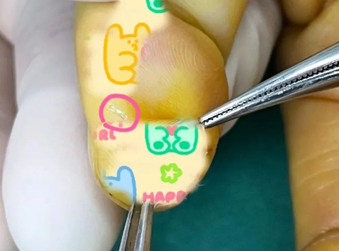 取出钢化膜碎片,切除神经瘤,并对伤口进行反复冲洗后,医生为菲菲缝合了伤口。