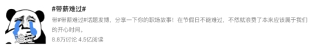 职场议题#带薪难过#、#成年人的世界没有愚人节 只有Q2#等频繁登上热搜,这种现象与此前同样被刷屏的#早安 打工人#如出一辙,都是职场内卷到“病入膏肓”的产物:老板不合理的需求、下班后的消息轰炸、来自甲方的灵魂拷问等等,都让“卑微打工人”不堪重负。甚至终于脱离了一天的疲惫工作之余,想在游戏中找回自己的“主场”时,都有可能收到来自老板的组队邀请,这些现象无一不诉说着职场人士的心酸。