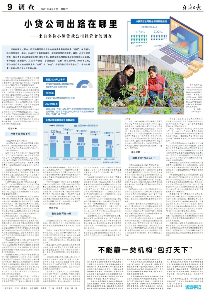 更重要的是,我们需要给小贷公司正名。杨国平介绍,当前,甚至有小额贷款公司的客户在银行贷款时受到歧视,小额贷款公司从业人员无法办理信用卡、房贷等业务的现象。这是由于近年来,部分网贷平台、“套路贷”等民间借贷机构在从事非法金融活动时常借“小额贷款”之名,导致持牌正规小额贷款公司“躺枪”“背锅”,对行业的声誉造成较大影响。