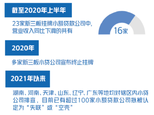 截至2020年上半年,23家新三板挂牌小贷公司中,共有16家营业收入同比下滑,有的甚至下滑幅度超过50%;其中12家净利润同比下滑。去年,更有多家新三板小贷公司宣布终止挂牌。