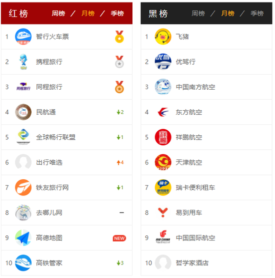 红榜:智行火车票、携程旅行、同程旅行、民航通、全球畅行联盟、出行唯选、铁友旅行网、去哪儿网、高德地图、高铁管家