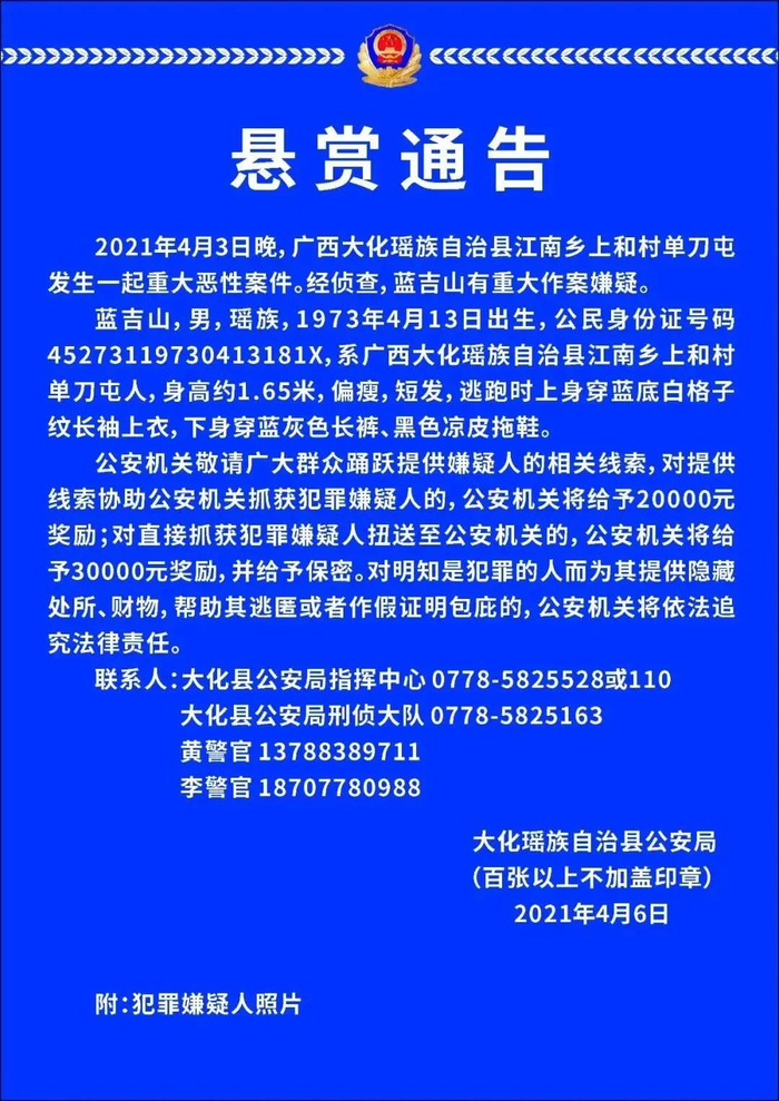 4月7日,河池大化瑶族自治县公安局发布一则悬赏通告称,大化江南乡上和村单刀屯3日晚发生一起重大恶性案件。据悉,嫌疑人疑在家中将妻子杀害后潜逃。目前,当地警方仍在抓捕中。(平安大化)