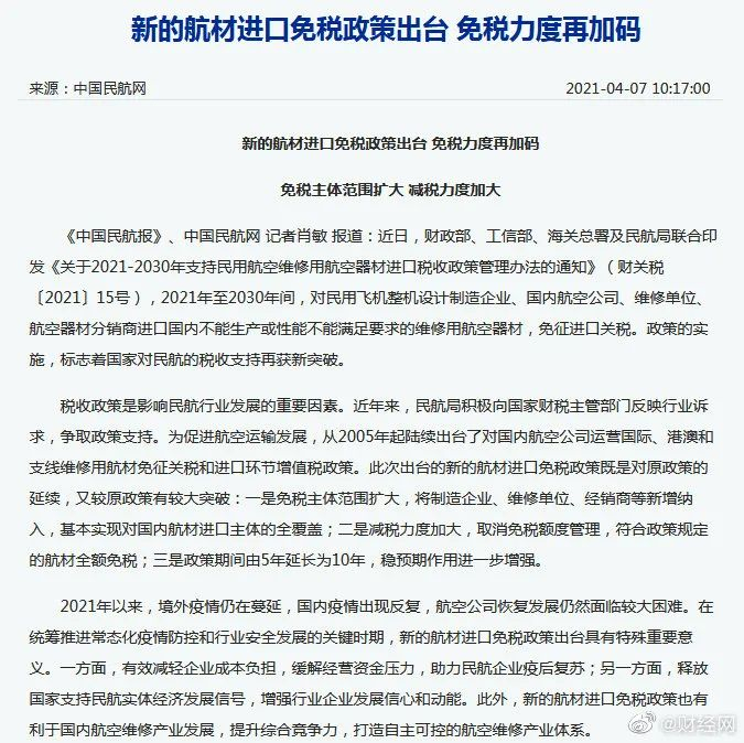 ●四部委出台新的航材进口免税政策