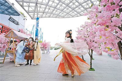 为何各大景区的春季游园活动热衷于“绑定”汉服文化?蔡明伟认为这与当下年轻人对传统文化的热爱程度逐年升温有关。以欢乐谷为例,其目标客户中非常大一部分是年轻群体,通过线上调查及服务公司的调查报告发现,越来越多的年轻人热衷于汉服文化,为了传播这一文化,加入了诸多自己的想法。“我们发现很多游客会拿着行李箱来到园区,带好几套汉服,根据不同的场景换不同的服饰打卡拍照。比如在以粉色为主的樱花栈道,他们会穿上白色、粉色的衣服,画面浪漫优雅,在拥有小船、流水的水杉林,他们又会换上青绿色的服饰,与水中倒影相得益彰。”