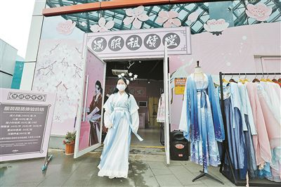 为了鼓励更多年轻人参与进来,园区活动的前期阶段还推出了穿汉服游园半价的活动,园区内外均设立了租赁汉服以及提供妆容服务的摊位。“身着汉服的人们形成氛围,让彼此的距离更加亲近,形成一种新的潮流社交的方式。”
