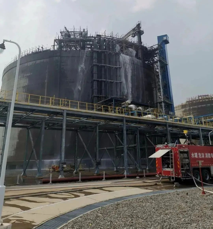 11时44分48秒,赖晓林操作SIS系统对0301-XV-2001阀门进行强制关闭操作,随即0301-XV-2001阀门开启,LNG开始喷射而出。11时45分00秒阀门全开。LNG喷射出后约10秒,TK-02储罐罐前平台起火。LNG发生喷射着火时TK-02储罐罐前平台有梁某等8人,罐顶有田某1人。