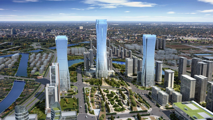 以宝能郑州中心为例,该项目作为河南省市重点项目,位据高铁东广场商务封面,依托亚洲最大的高铁枢纽之一的郑州东站,由国际知名建筑设计公司美国MZA担纲设计,具体由1栋306米、2栋240米、1栋150米、4栋120米、20多栋100米等超高层、高层建筑组成的中原地标建筑群,规划有中央商务区、中央商业区、中央活力区、中央豪宅湾区四大核心功能区,打造集产业、商务、社交、休闲、购物、居住、创业中心为一体的306米中原地标群TOD国际综合体。