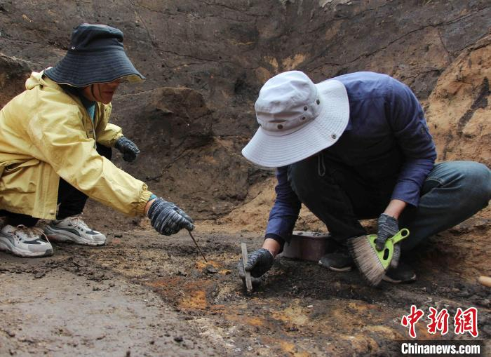 考古人员正在现场用手铲、刷子发掘清理人骨等遗物。 赵晓 摄