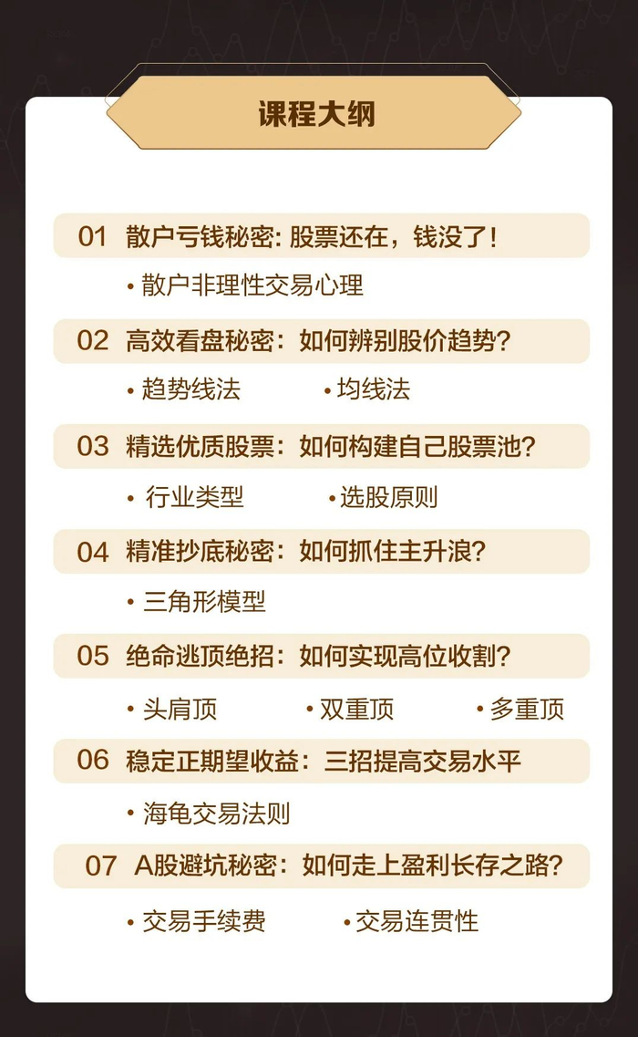 如果你想实现预期的交易收益,避免成为股市韭菜,却不知从何开始;如果你对技术分析有很多不懂,却不知道向谁请教;如果你报了很多班,但太忙总忘记,那么强烈建议你加入我们的课程学习。