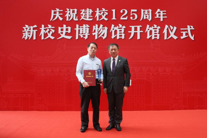 多年来,学校历任校领导不但高度重视校史研究和校史博物馆建设,还多次捐赠自己的藏书、档案、手稿、照片、珍贵证件等物品,特别是学校的几位主要领导,更是率先垂范,先后多次捐赠,极大丰富了学校的历史资料和重要事件的历史档案。杨振斌、林忠钦为老领导们颁发捐赠纪念奖杯。