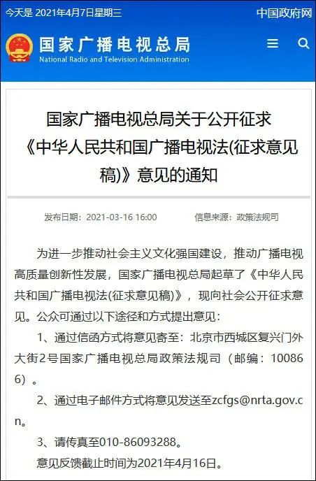 事实上,分级制度的出台备受关注。3月16日,国家广播电视总局官网发布关于公开征求《中华人民共和国广播电视法(征求意见稿)》意见的通知。