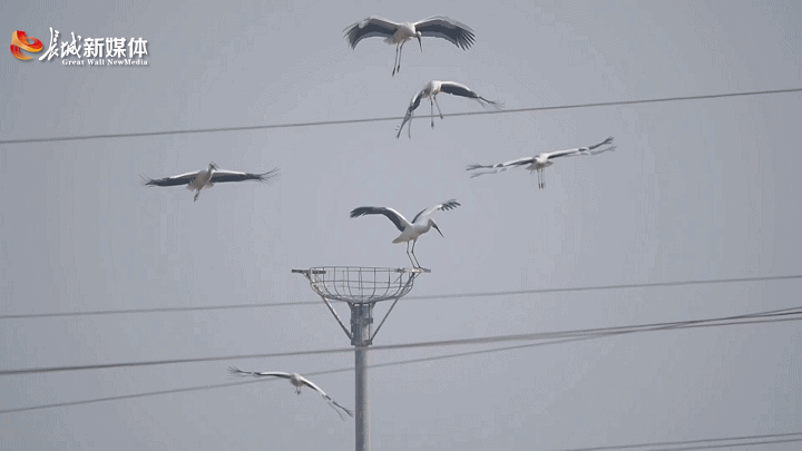 循声望去,一排排十几米高的高压铁塔上筑有鸟巢,不远处,东方白鹳结伴飞翔,在空中“起舞”。