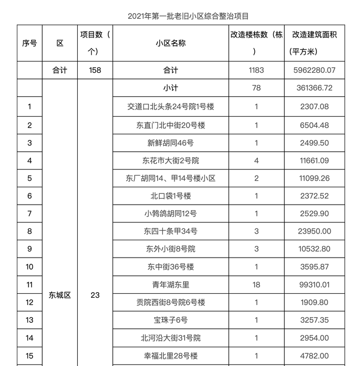 2021年第一批老旧小区综合整治项目名单涉及到东城、西城、丰台、通州、大兴、昌平、密云7个区,共158个小区,改造楼栋数1183栋,改造建筑面积约596万平方米。北京日报客户端记者梳理发现,相较于2020年第一批老旧小区综合整治项目名单,无论是改造楼栋数还是改造建筑面积,均有所增加。