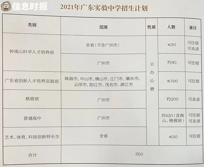 信息时报记者获悉,今年,省实高中将面向广东省、广州市招收应届初中毕业生850名,其中自主招生62人、名额分配310人,通过“南山班”、“省创班”、第一批(自主招生)、第二批(名额分配)、第三批,以及面向全省的特长生录取。师资方面,今年,省实拟聘10名博士研究生教师,均毕业于北京大学。