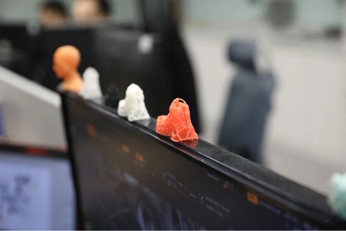 鲁琪的电脑显示屏上粘着几件小型的3D打印作品。
