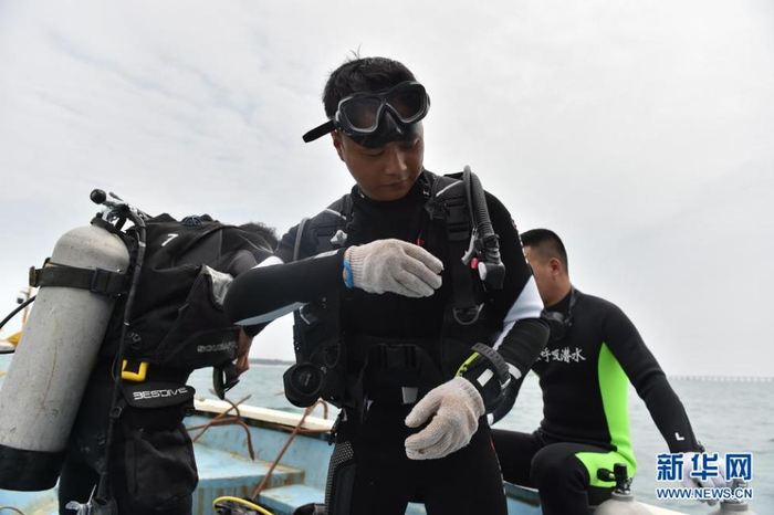 4月7日,在广西涠洲岛珊瑚礁修复实验区附近的海域上,黄雯(中)检查装备准备潜水作业