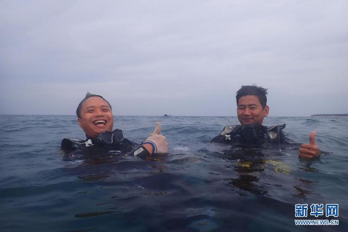 4月7日,在广西涠洲岛珊瑚礁修复实验区海域,结束水下作业后,黄雯(左)与伙伴在水面上合影