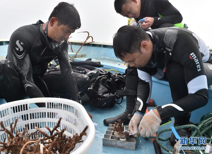 4月7日,在广西涠洲岛珊瑚礁修复实验区海域,黄雯(前右)将从海底捡到的掉落的珊瑚绑扎固定在苗托上