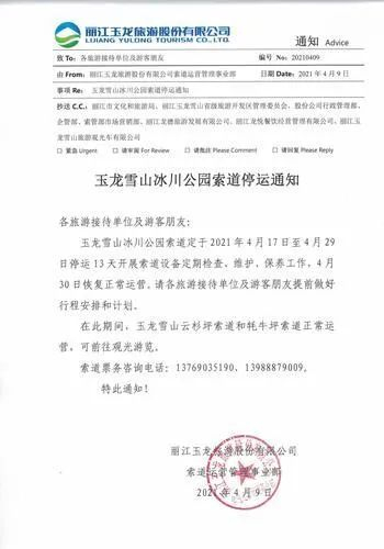 近日,丽江玉龙旅游股份有限公司发布玉龙雪山冰川公园索道停运通知,其中明确冰川公园索道定于2021年4月17日至4月29日停运13天,开展索道设备定期检查、维护、保养工作,4月30日恢复正常运营。