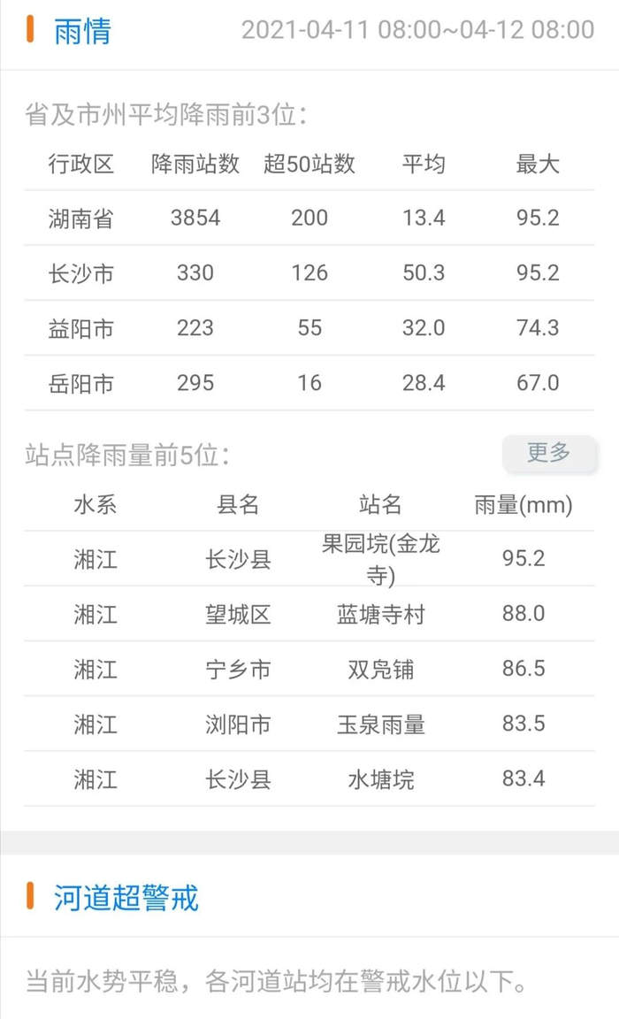 根据市气象台监测,10日8时至11日8时,全市出现小到中雨,全市平均雨量9.6毫米,小雨146站,中雨107站,最大降水量28毫米(宁乡巷子口)。