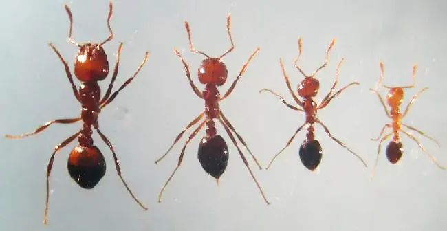 红火蚁胸腹连接处有2个腹柄结,普通蚂蚁为1个。图据华南农业大学红火蚁研究中心陆永跃教授