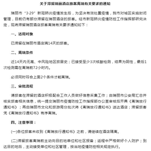 通知要求,各位旅客未收到《离瑞放行通知书》之前,请继续在酒店隔离;滞留旅客离瑞前主动向目的地单位和社区报备;返程中严格做好个人防护;到达目的地后,主动接受单位和社区管理,按当地疫情防控相关规定执行。