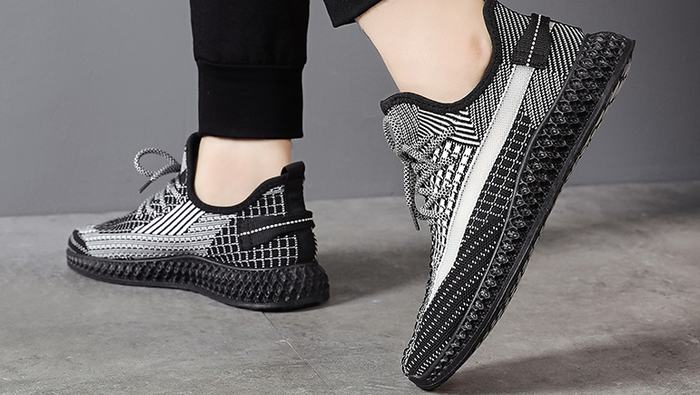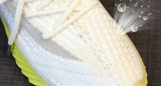 鞋面采用一体成型的飞织工艺,用纱线原料制成,针织本身就是网眼结构,加上两侧的透气带,透气性一绝。
