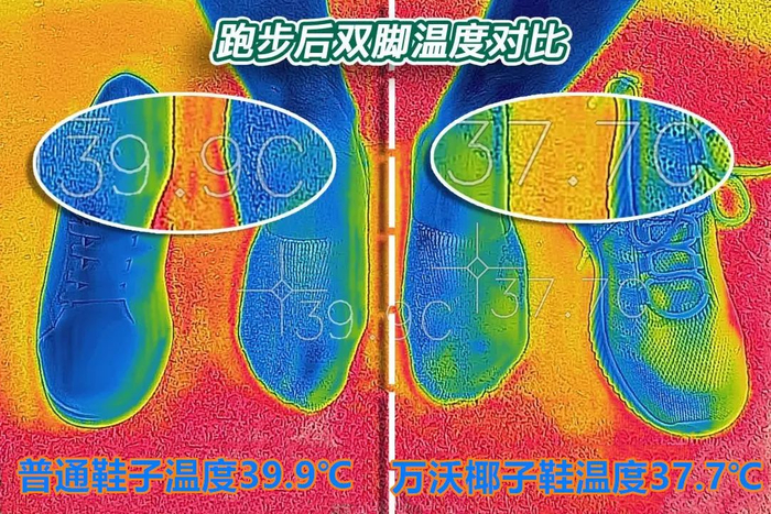 厂家测试,穿上这双鞋跑步半个小时,鞋内温度不升高,比普通鞋子温度还降了2℃左右。