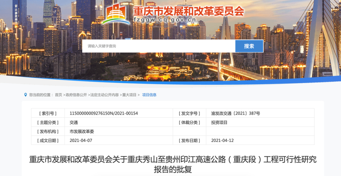 近日,重庆市发展和改革委批复关于重庆秀山至贵州印江高速公路(重庆段)工程可行性研究报告,同意建设重庆秀山至贵州印江高速公路(重庆段)。