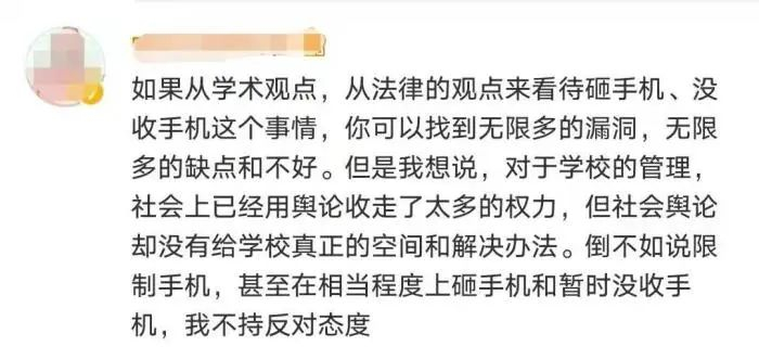 事情在舆论中掀起热议。支持者认为,手机进校园屡禁不止,砸手机实属无奈之举,此举确实从外界约束了学生。