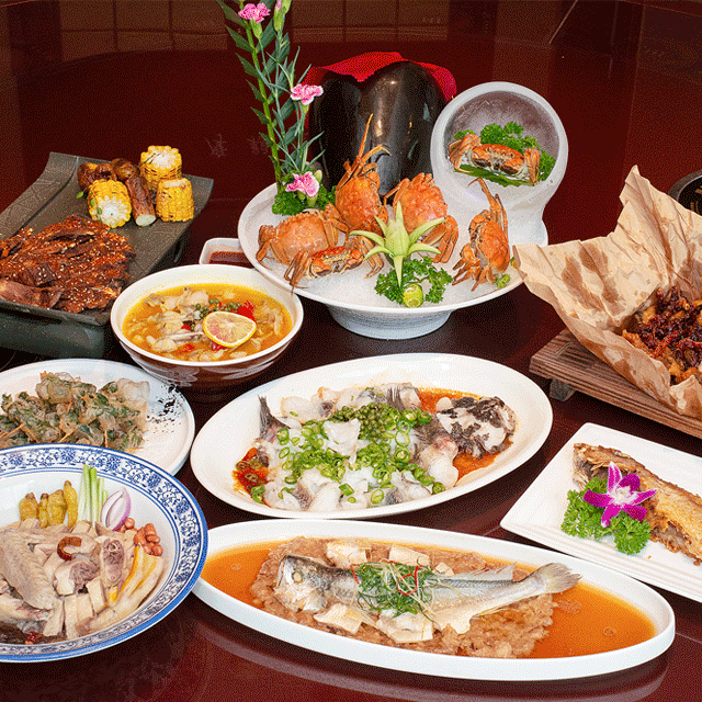 (例汤1古、卤水鹅三宝1份、清蒸鲟龙鱼1条、避风塘炒明虾、煮牛肉1份 、脆奶蒜香骨1份、汁茄子1份、荷叶木耳蒸鸡1份、蒜茸炒时蔬1份)